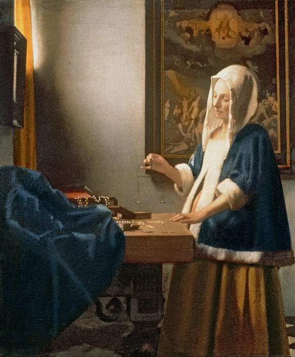 To some critics who perceive her as measuring her valuables, the juxtaposition with the final judgement suggests that the woman should be focusing on the treasures of Heaven rather than those of Earth. Woman Holding a Balance – Wikipedia