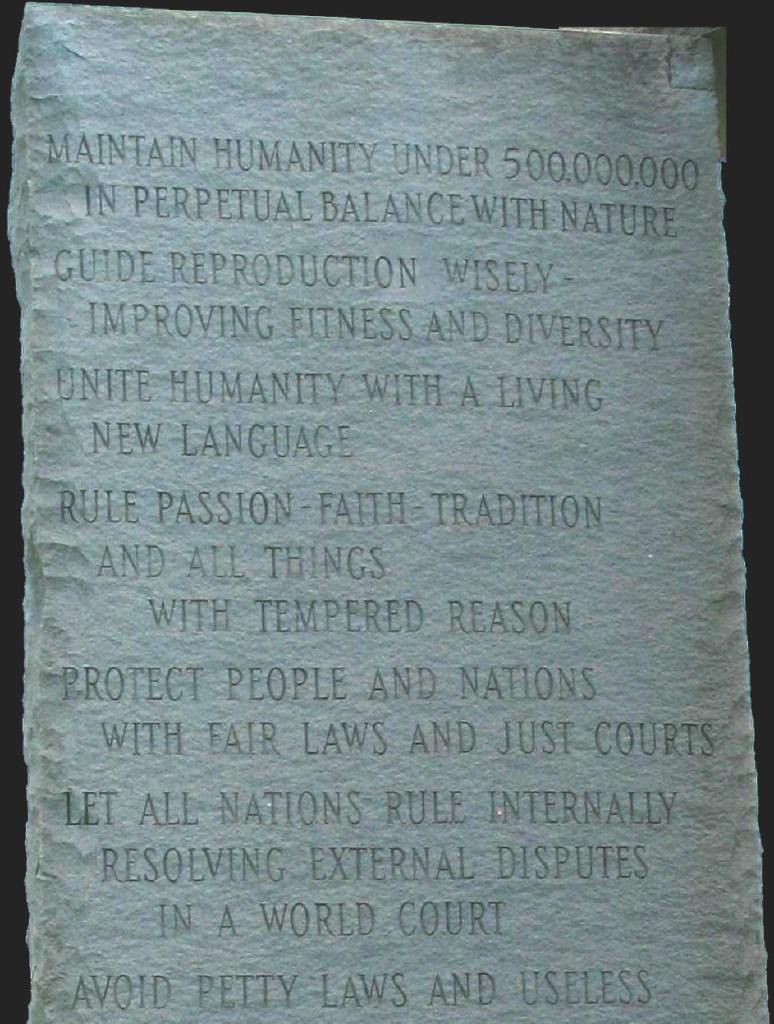 Let’s look at Satan’s ten commandments on the former Georgia Guidestones, which haven’t been destroyed in the minds of globalists. These instructions were engraved in eight different languages, one language on each face of the four large upright stones. The languages were English, Spanish, Swahili, Hindi, Hebrew, Arabic, Chinese, and Russian.