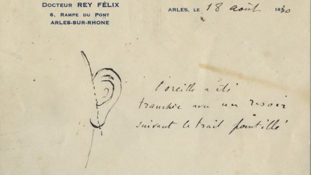 In Arles, France in 1888, Vincent van Gogh cut off his ear with a razor, leaving just a bit of the lobe. Here’s the doctor’s sketch: