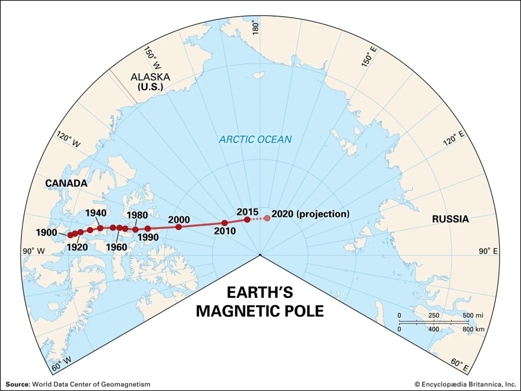 The following image can give us an idea how labor pains work. This is the magnetic north pole moving faster and faster toward Siberia, 34 miles a year: